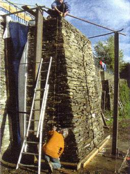 Les principes mécaniques spécifiques à la pierre sèche (et novateur) qui vont être utilisés par la suite ont été validés par l’Analyse des caractéristiques des systèmes constructifs non Industrialisés (ADEME- CSTB 2008) piloté par le CSTB à l’intégration du réseau Ecobâtir Les Premières études traitant de la stabilité interne des murs en pierres sèches remontent au XIX siècle. En 1834, le lieutenant Général sir John Burgoyne entreprend une campagne d’essais à l’échelle 1 sur quatre Murs en granite bâtis à sec (Burgoyne 1853). Les quatre murs sont de même longueur et de même hauteur et de même volume mais présentent des profils différents, l’objectif étant de tester l’influence de la géométrie sur la stabilité de l’ouvrage. Les murs sont ensuite remblayes avec de la terre pour évaluer leur comportement sous sollicitation. Le compte rendu de Burgoyne indique que, si les deux premiers sont restés stables, les deux autres ont rompus par renversement suivant un plan de rupture partant du pied du mur et incliné par rapport à l’horizontale. On retrouve cette notion, plan de rupture interne dans l’étude de Casimer Constable en 1875, étude réalisée pour le compte de l’ Américan Society of Civil Engineers |